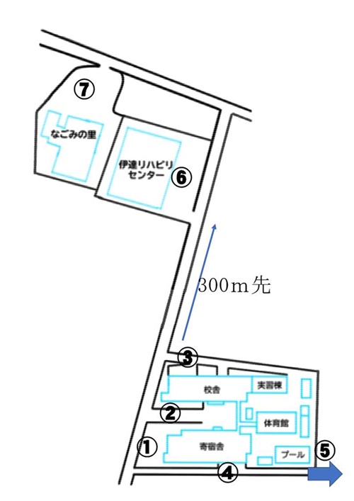 (2)学校周辺が満車になった場合は、近隣施設の「なごみの里」、「伊達リハビリセンター」に駐車していただきま