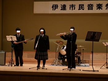 11月9日(日)、「伊達市のだて歴史の杜カルチャーセンター」にて、第43回だて市民音楽祭が開催されました。本校の音楽部員8名が参加し、「やってみよう/WANIMA」、「さよならエレジー/菅田将暉」、「怪獣の花唄/Vaundy」の3曲を披露しました。新一年生はこのような大きな舞台は初めてで、緊張しながらも最後まで演奏をすることができました。2・3年生は、昨年よりも演奏力がアップしており頼もしかったです。応援をいただきありがとうございました。