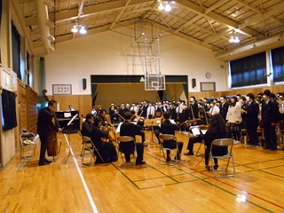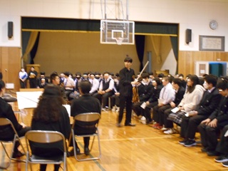 演奏してくださったのは、札幌交響楽団の皆様です。弦楽によるアンサンブル(ヴァイオリン、ヴィオラ、チェロ、コントラバスでの演奏)でした。途中、楽器の特徴や担う音律などを分かりやすく説明してくださり、生徒たちは楽しく学ぶことができました。質問タイムもあり、楽器にまつわる様々な大変さや楽しさ、そして厳しさを伝えていただき、生徒は時に楽しげに、時に真剣な表情で聞いていました。