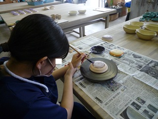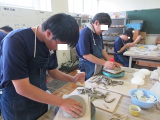 一つのお皿を完成させるためには、時間や多くの手間がかかります。板づくり(粘土を薄く伸ばしたもの)から始まり、素焼き、やすりがけ、撥水剤塗、釉薬掛け、本焼き、やすりがけといった多くの工程を経て完成します。各工程では注意すべき点が複数あり、生徒は細心の注意を払いながら取り組んでいます。