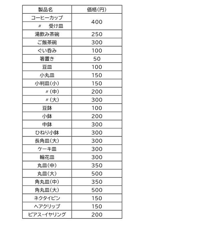 今年度は豆皿、小丸皿、小判皿(大・中・小)、コーヒーカップ、湯飲み茶わん、ご飯茶碗等に加え、各種大皿やアクセサリー等の様々な製品を販売する予定です。