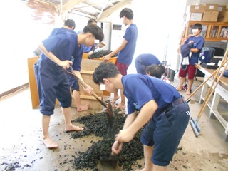 さらに、本校の特色ある取組として、藍の栽培から「すくも」製造、藍建てに至るまで一貫して行い、本藍染め製品を製作しています。深みのある美しい藍色は、生徒達の手仕事と伝統の技が重なり生まれたものです。