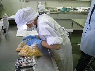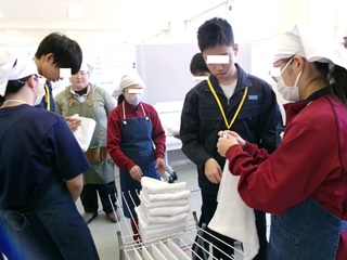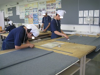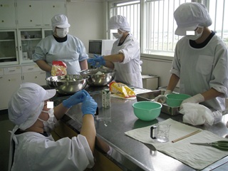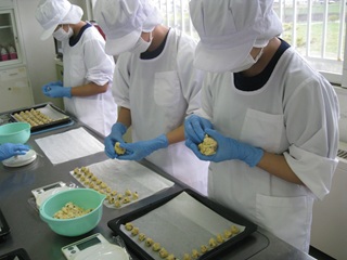 家庭総合科では、安全、身だしなみ、整理整頓、礼儀、仲間とのコミュニケーション等を意識し、「清掃」「調理」「縫工」の三つの作業種を行っています。「清掃」では、敷地内の窓・床清掃の他に、近隣施設の窓清掃を行い、実践的な場で働く経験を積んでいます。「調理」では衛生面に留意し、細かいルールを覚え、仲間と協力しながらロックビスケット製造を行っています。主に学校祭や校内で販売学習を行っています。「縫工」では、正確さを意識しながら、ミシンを使用し、自学科用エプロン等の製作に取り組んでいます。また、他学年との学び合いや学科の伝承も大切にしています。